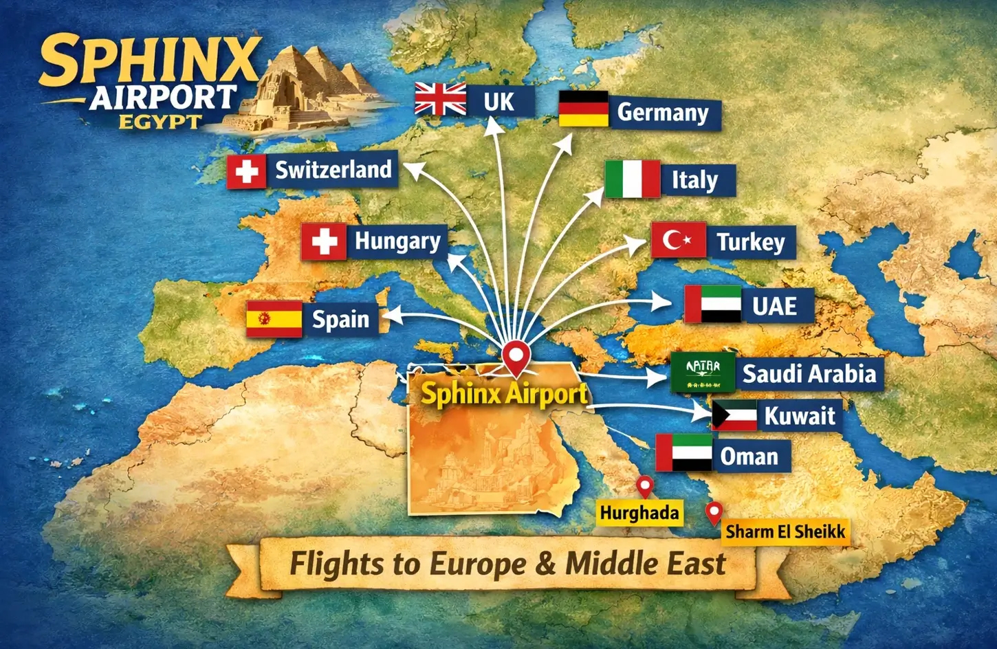 Domestic flights from Sphinx Airport connect Cairo to destinations including Luxor, Aswan, Hurghada, Sharm El Sheik, and Alexandria, making it an ideal starting point for travelers beginning their journey in various Egyptian cities, from Giza, then heading south or to the coast.